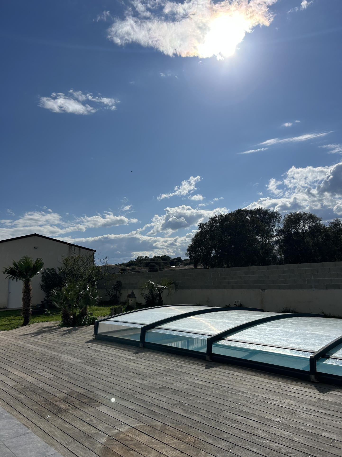 Terrasse en teck de 100 m2, idéale pour profiter des journées ensoleillées, équipée d’une pergola électrique pour un ombrage agréable.