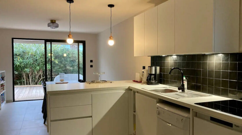 Un séjour avec cuisine ouverte, entièrement équipée et meublée (électroménager haut de gamme), offre un espace de vie convivial et chaleureux.Une chambre avec salle d’eau / WC bénéficie d’un accès direct à la maison et d’une entrée indépendante, parfaite pour recevoir ou envisager un espace locatif.