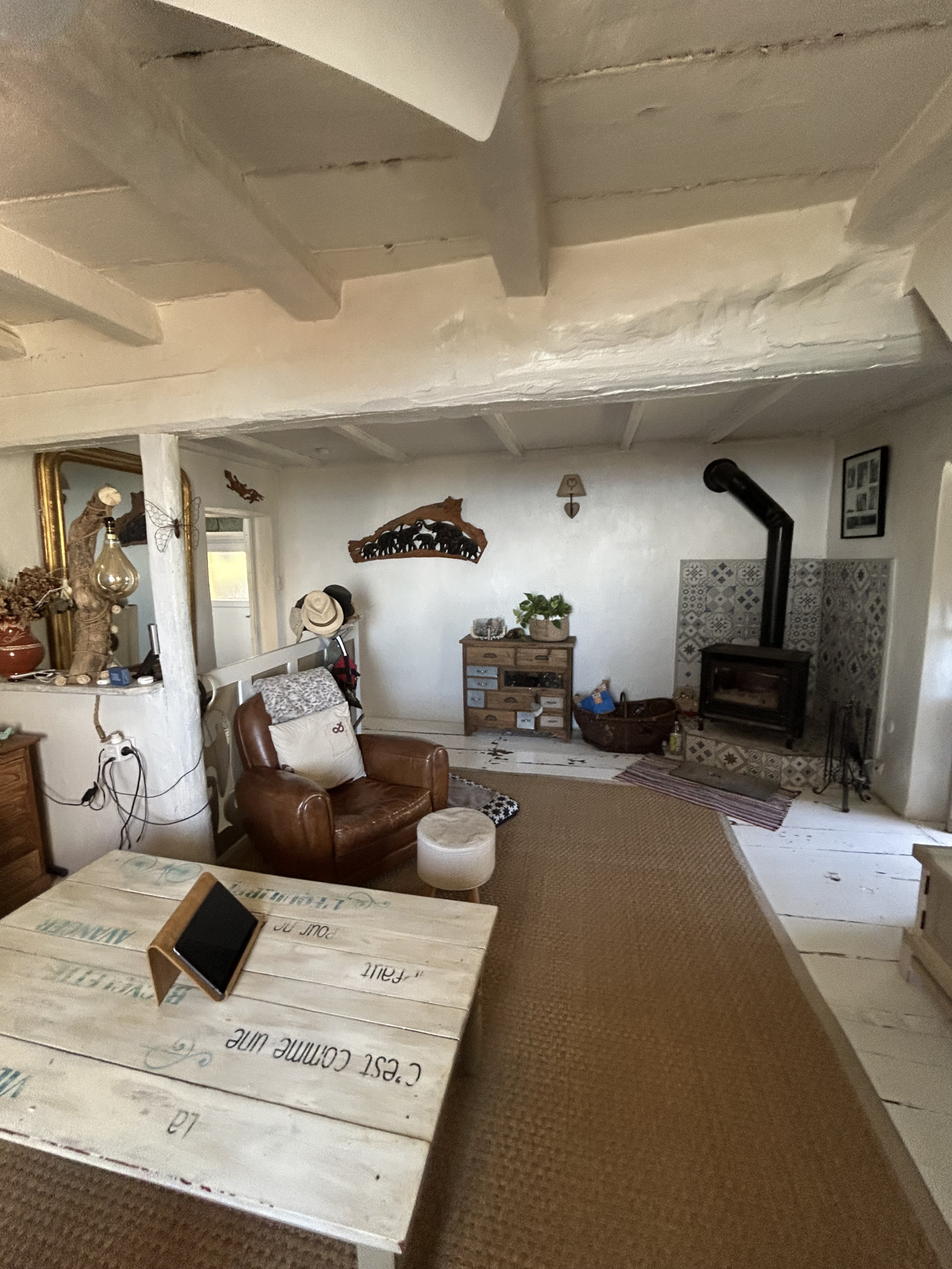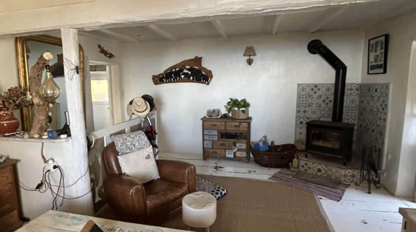 R+2 : un séjour chaleureux avec poêle à bois, une cuisine indépendante meublée et équipée avec cheminée, ainsi qu’une salle de douche avec WC.