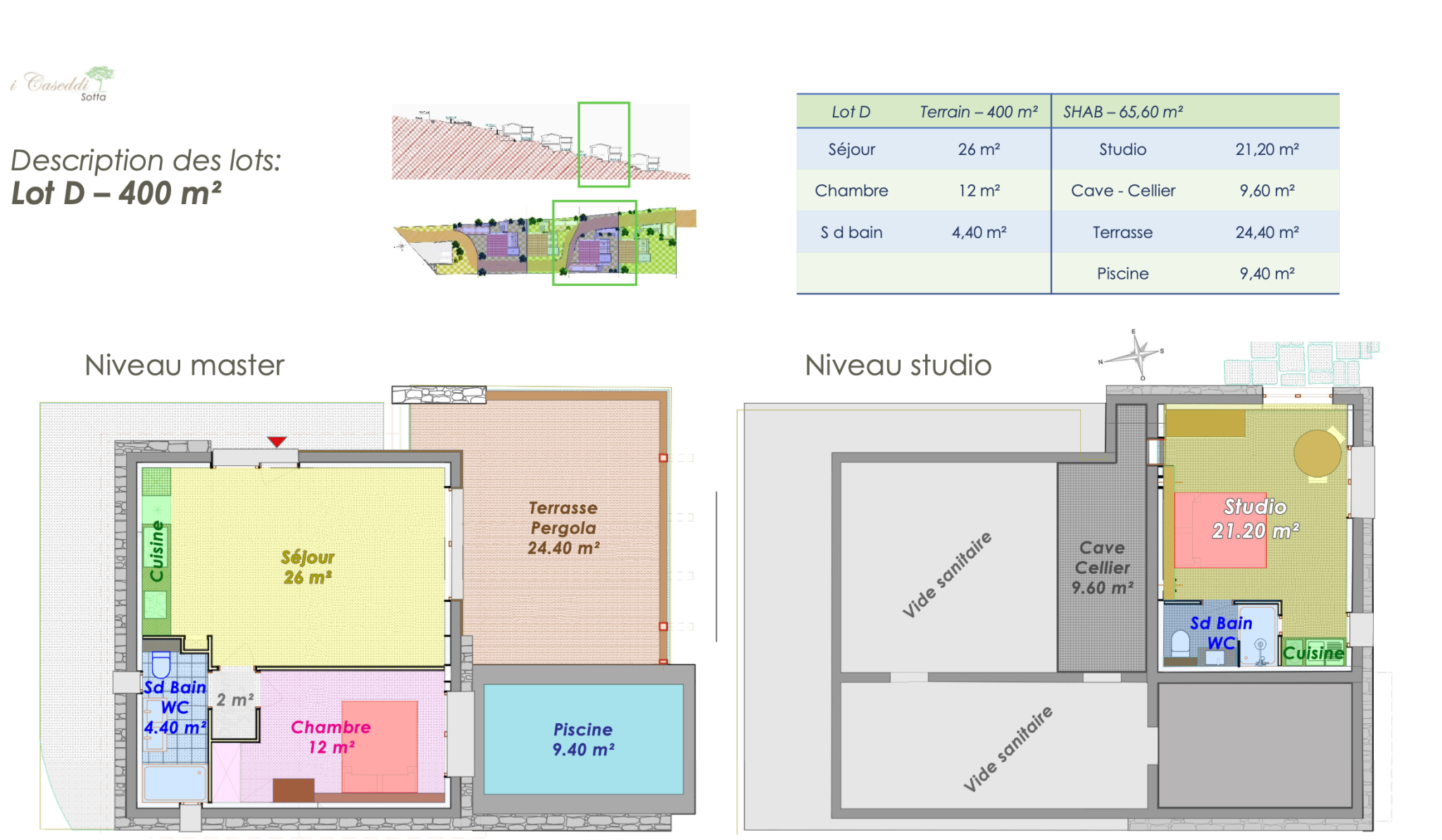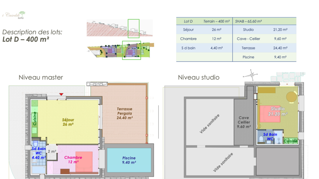Chaque maison bénéficie : D’un terrain privatif aménagé d’essences locales D’une piscine privative-SPA (14 m2) Deux parkings privatifs, terrasse et pergola en bois, une cave