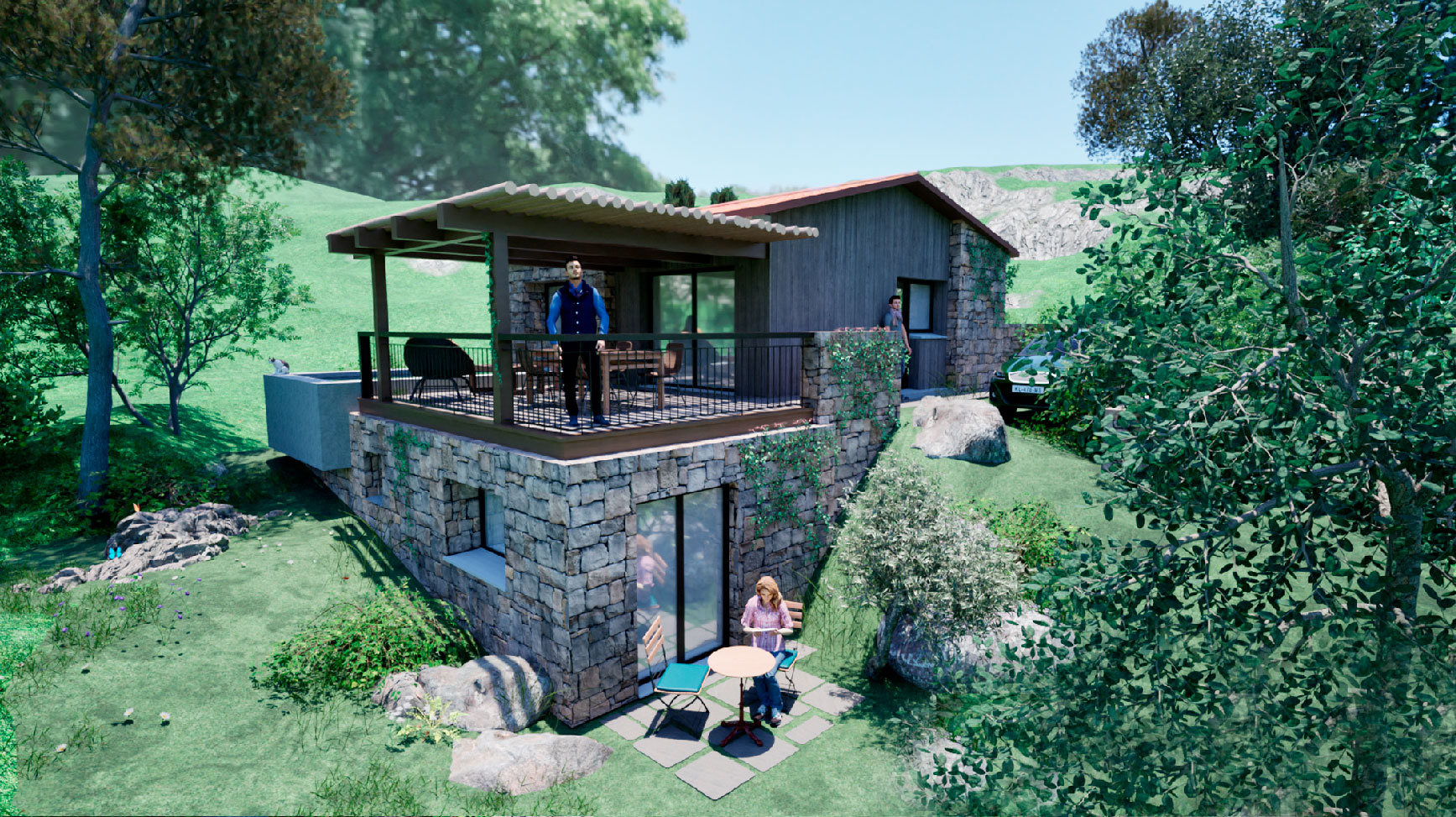 La conception épouse parfaitement le relief naturel du terrain, répartissant les espaces de vie sur deux niveaux pour un maximum d’intimité et de confort.