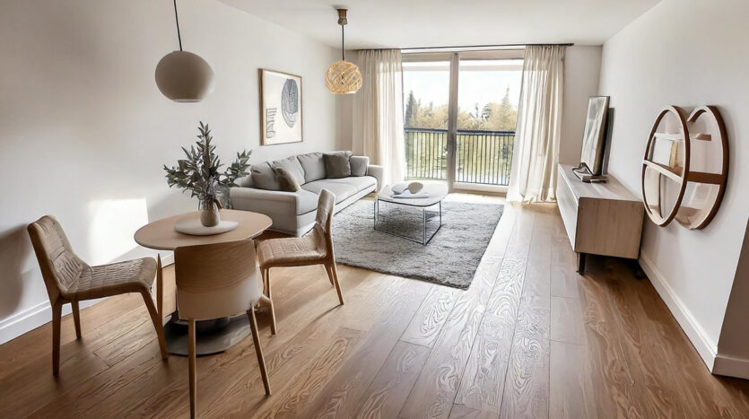 L’appartement se compose d’une entrée, d’un séjour lumineux, de deux chambres avec rangements, d’une salle d’eau, d’une buanderie et d’un WC séparé.